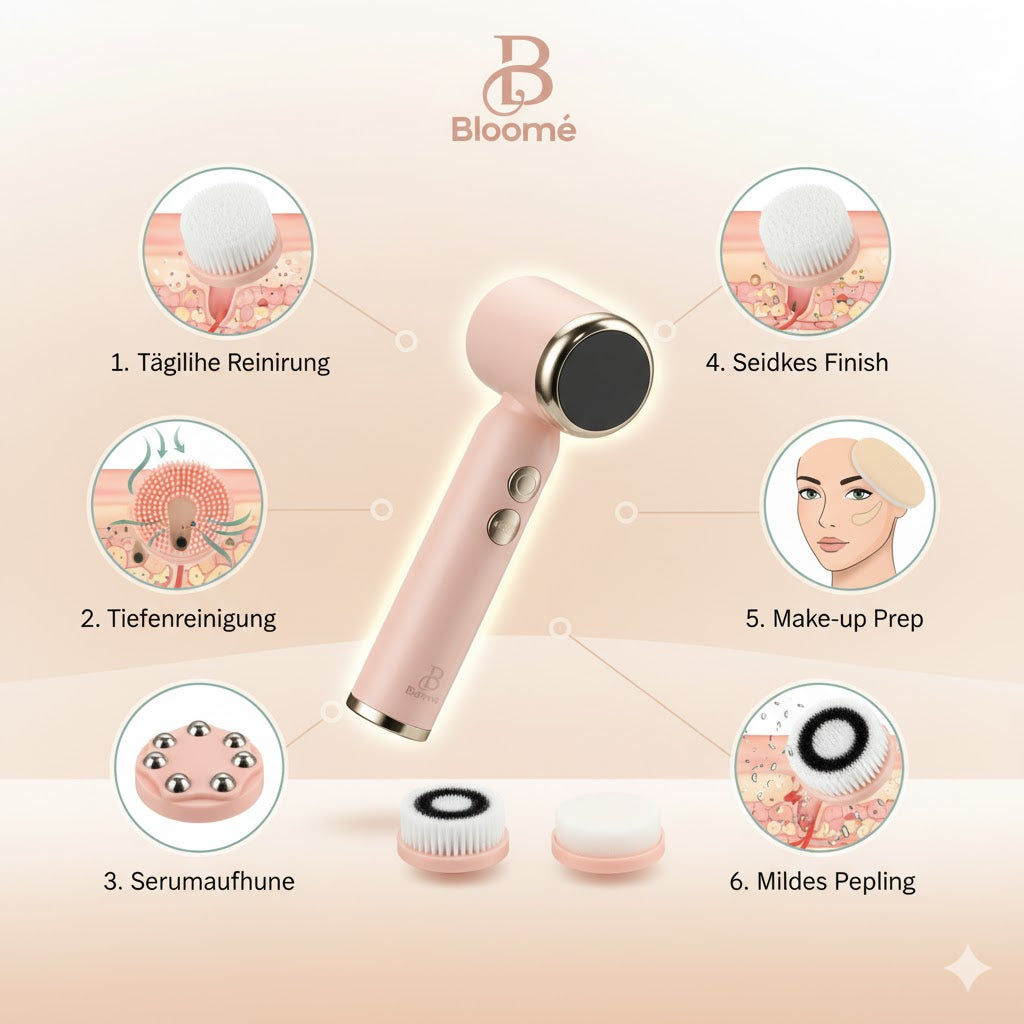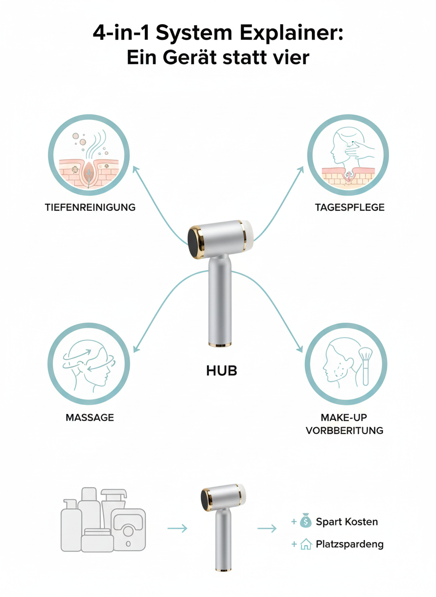 Das 4-in-1-Design kombiniert Tiefenreinigung, Tagespflege, Massage und Make-up-Vorbereitung in einem kompakten Handstück.