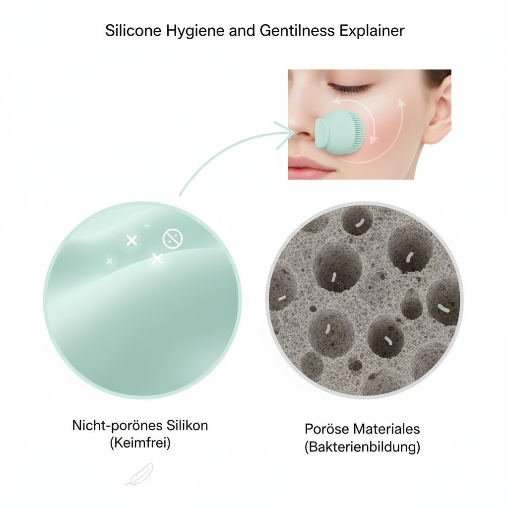 Silikon ist nicht-porös und antibakteriell – perfekt für die morgendliche Routine. Er reinigt gründlich, ohne die Haut zu reizen